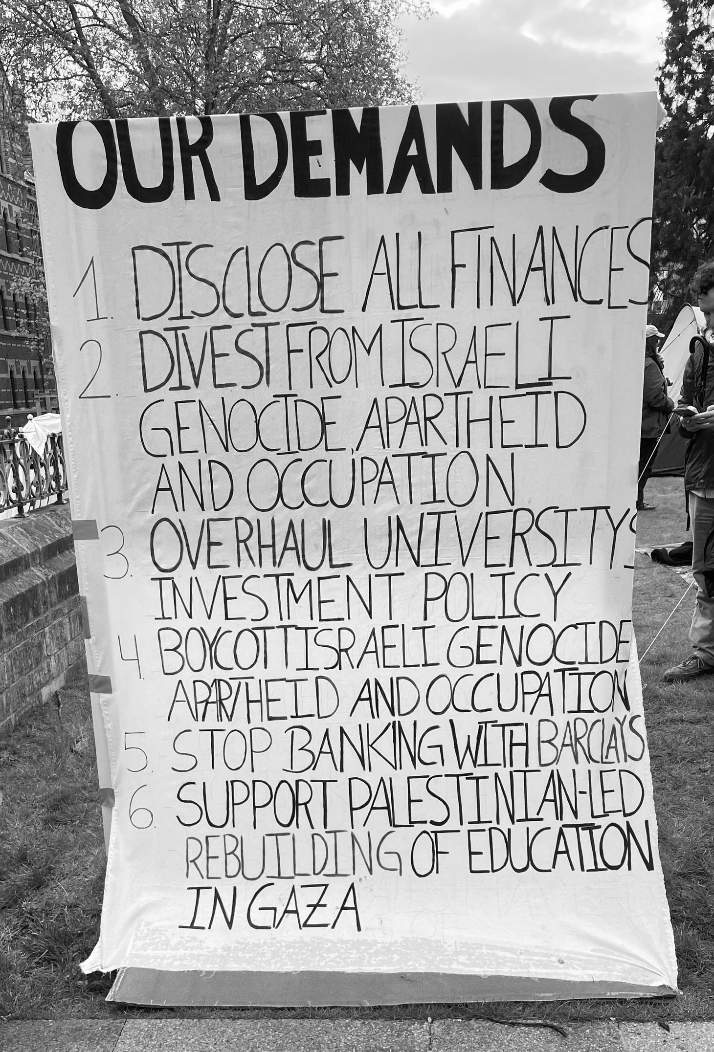 Demands of ‘Oxford Action for Palestine’ listed in the ‘Liberated Zone’ outside the Pitt Rivers Museum.